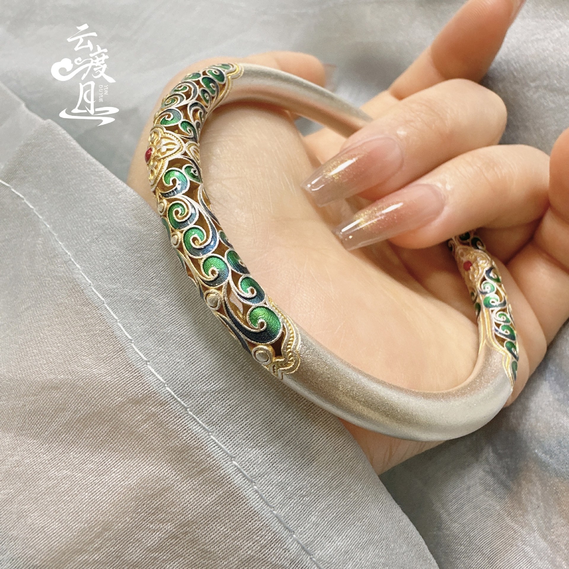 S999 Sterling Silver Enamel Scroll Pattern Gold-Painted Bracelet For Women, Chinese Traditional Style, Fixed Bangle, All-Match Jewelry